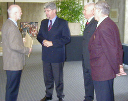 22.09.2001 Anläßlich eines Besuches des Verkehrsminister Ernst Schwanhold im Grevener Rathaus überreichen Vertreter der Bürgerinitiative ein elfseitiges Schreiben mit Einwenden und Forderungen. Bürgermeister Koling zeigt kein Interesse, den Verkehrsminister auf die Probleme des zukünftigen Fluglärms anzusprechen. Per Ratsbeschluß hat Bürgermeister Kolling den Auftrag, sich für ein Nachtflugverbot einzusetzen. Verkehrsminister E. Schwanhold verspricht das Schreiben unter der Vorgabe zu lesen, dass der Überbringer verspricht, "keine Blumen aus Übersee kauft und keinen Interkontflug durchführt".???? |